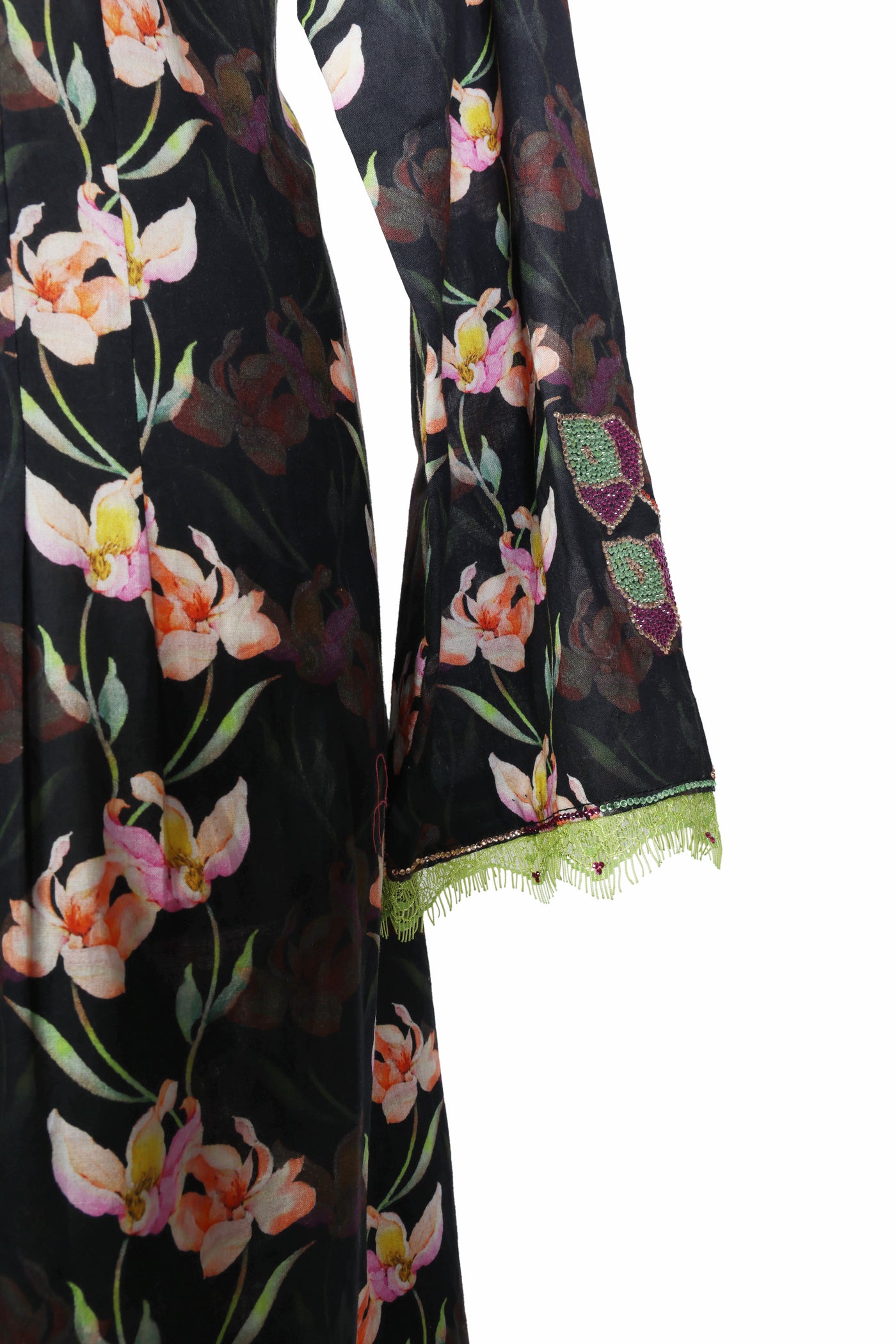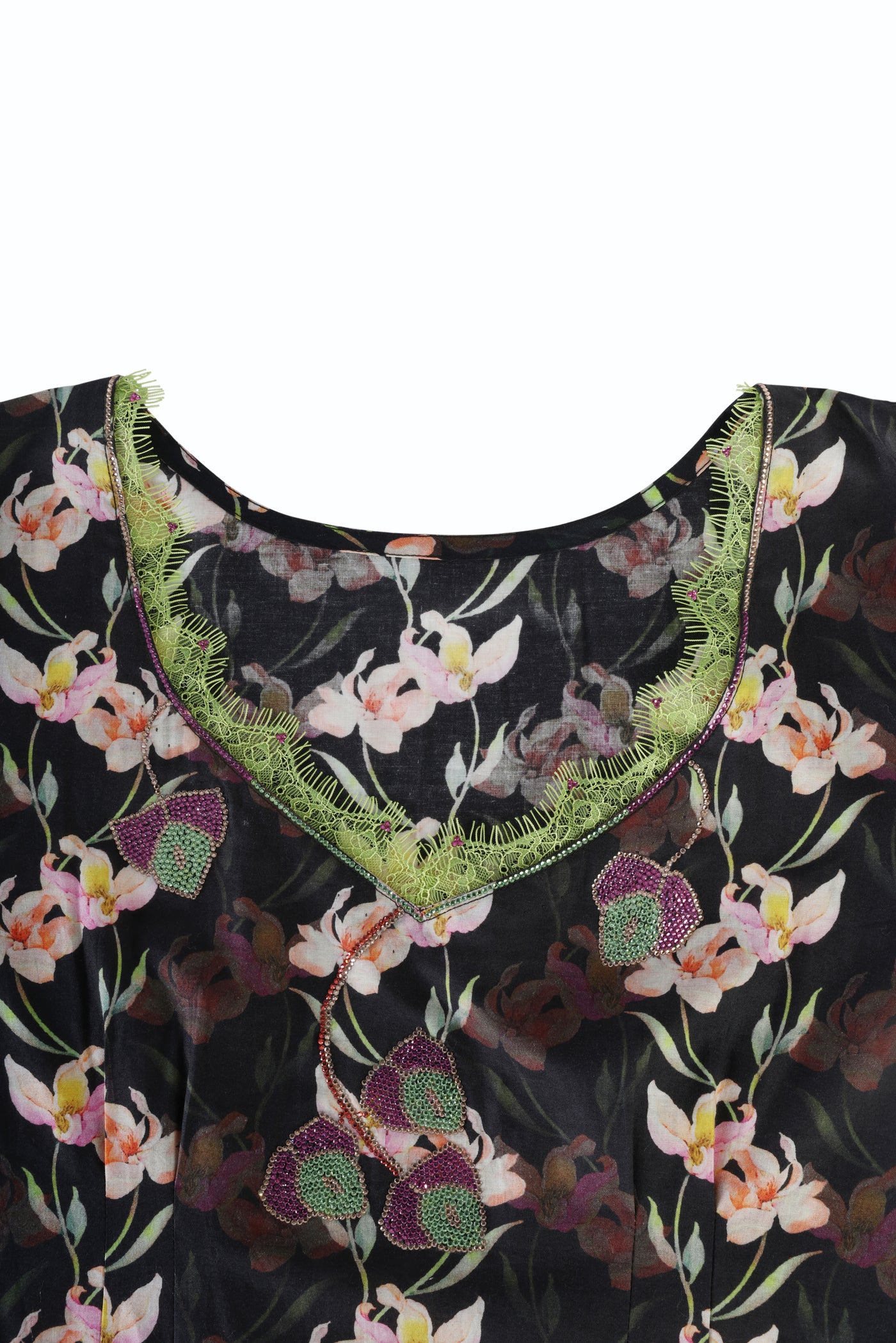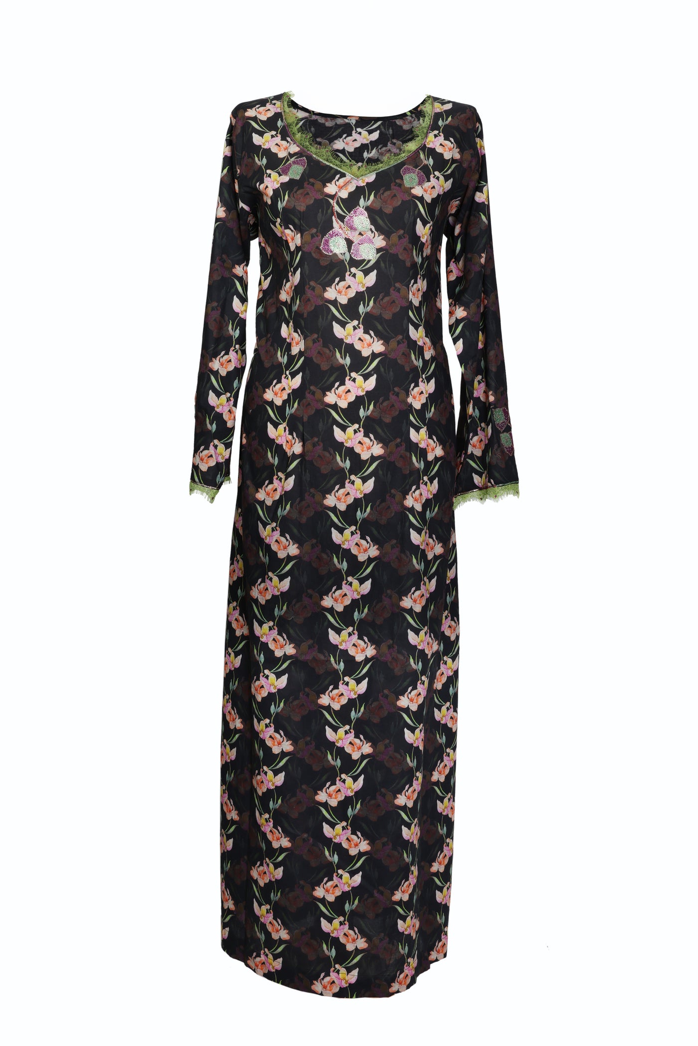 This Jalabiya is crafted from soft cotton fabric, offering comfort while keeping an elegant look. The black base is decorated with floral prints in shades of pink, white, and purple, accented with a green lace-trim neckline. Crystal embellishments around the neckline and on the floral designs add a touch of sparkle, giving the dress a refined and graceful finish. Its relaxed fit makes it perfect for everyday wear or special gatherings.