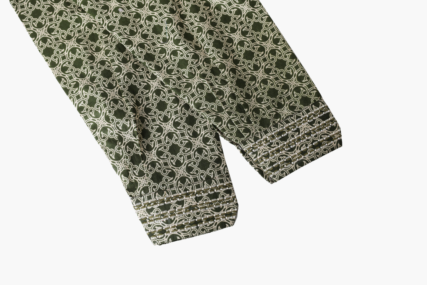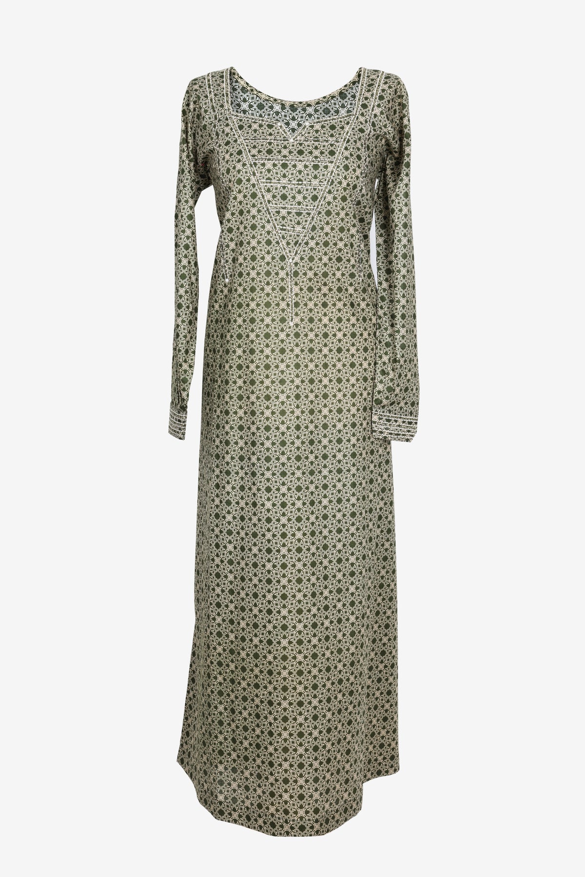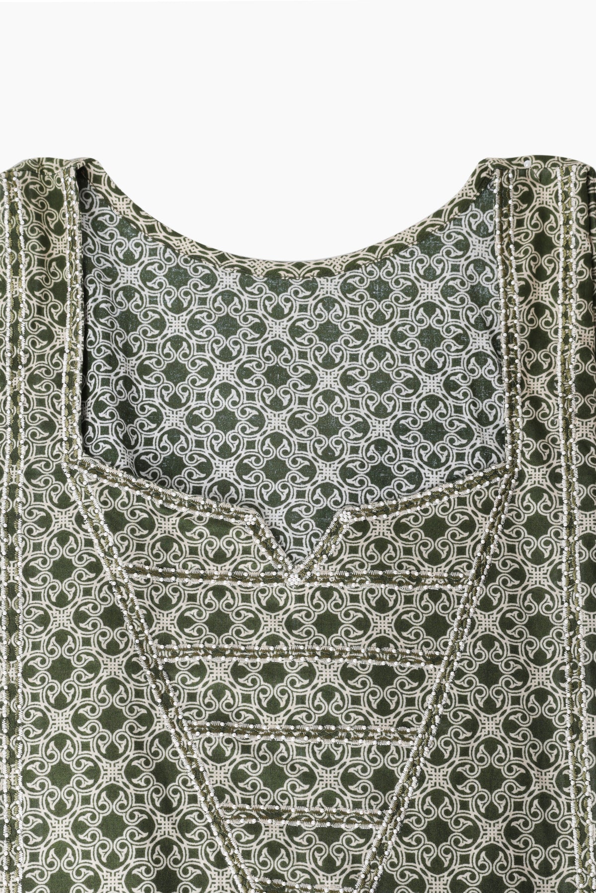 This Jalabiya is made from breathable cotton fabric, combining style with everyday comfort. It features a green base with an intricate geometric pattern in white, giving it a refined and traditional look. The neckline is enhanced with embroidered detailing and bead-like embellishments, adding texture and elegance. Its straight cut offers a modest and versatile silhouette that works well for both casual wear and gatherings.