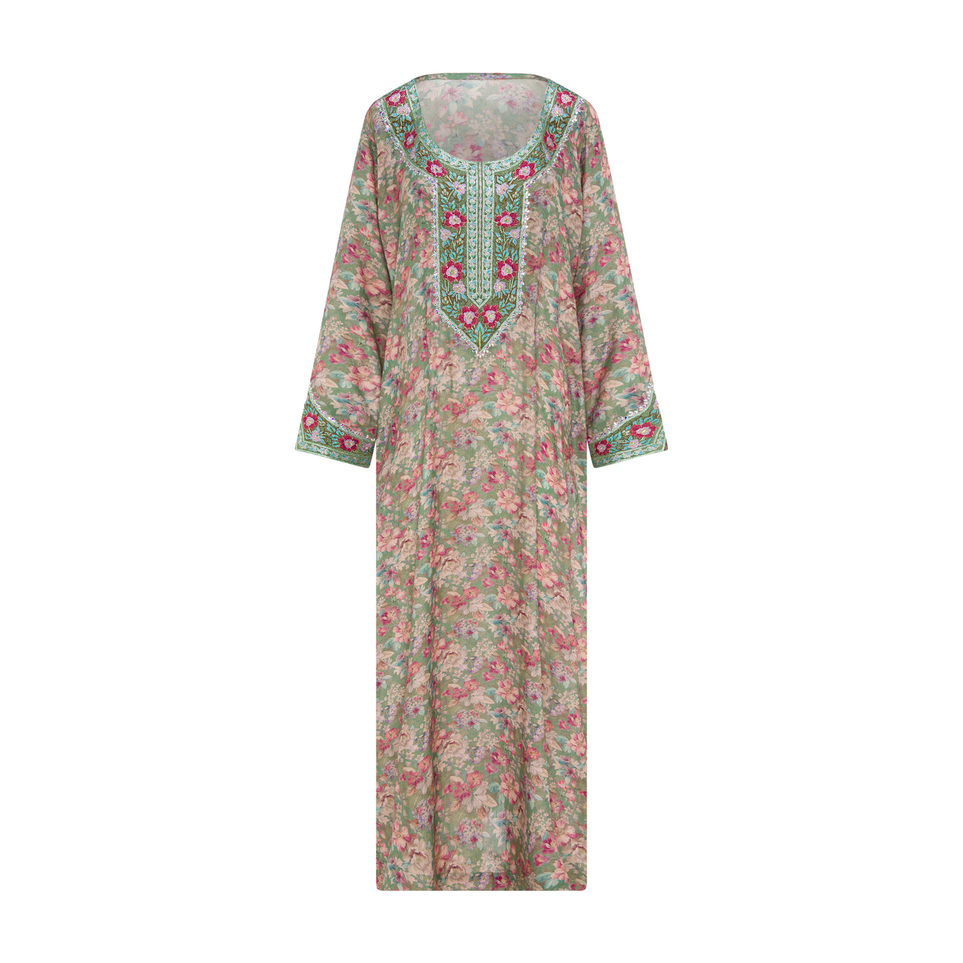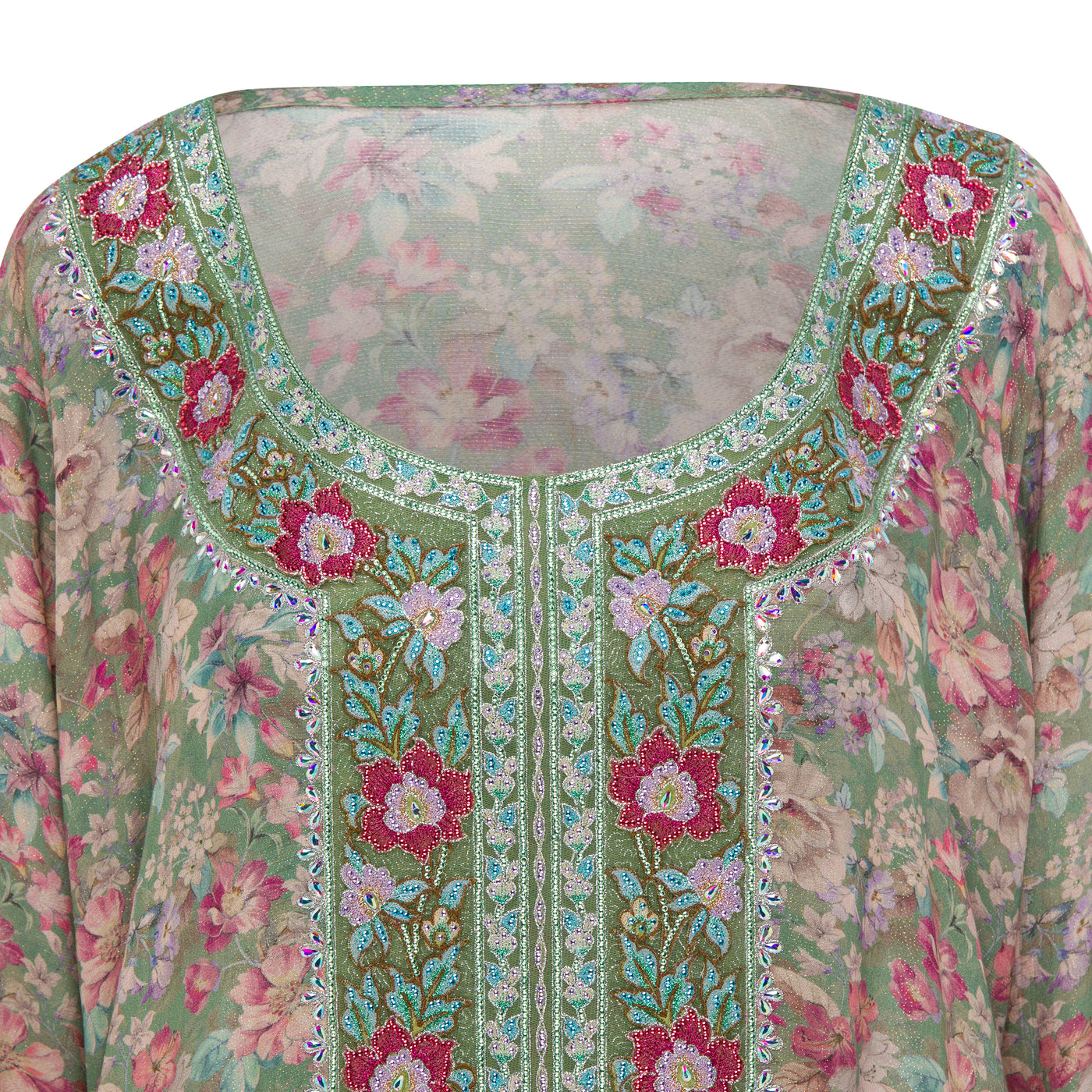 Gracefully designed in premium Hindi silk, this pastel green Mukhawar features a soft floral print and is beautifully elevated with 3D hand embroidery. Adorned with vibrant pink, lavender, and turquoise threadwork, the neckline and front panel showcase delicate crystal accents, and beaded embellishments that shimmer with movement.