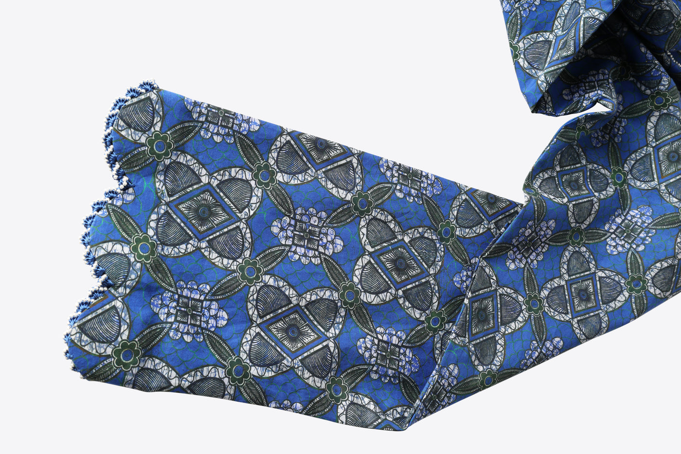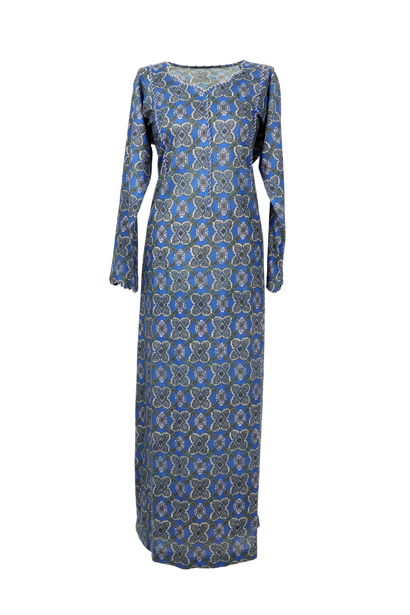This Jalabiya is made from breathable cotton fabric, designed for comfort and ease of wear. The base color is blue with a bold geometric pattern in black, grey, and green, creating a modern yet traditional look. The neckline and panel lines are detailed with embroidered accents that add depth and elegance. Its modest cut and intricate design make it perfect for everyday wear or semi-formal gatherings.