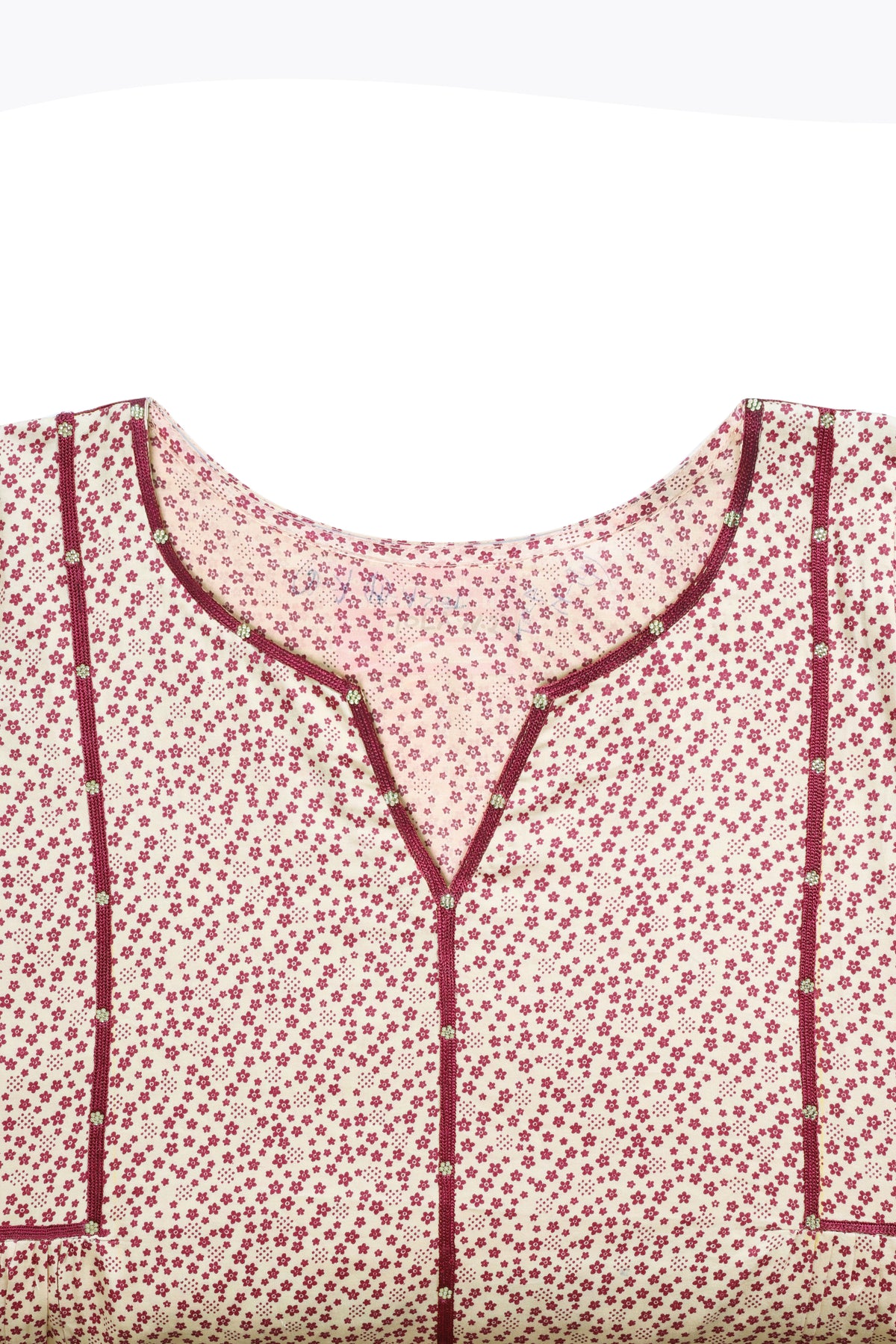 This cotton dress features a soft cream base with delicate maroon floral prints, giving it a fresh and charming look. The neckline is styled with maroon fabric piping for an elegant touch, creating a simple yet eye-catching design. The cotton fabric makes it breathable and comfortable, perfect for casual wear.