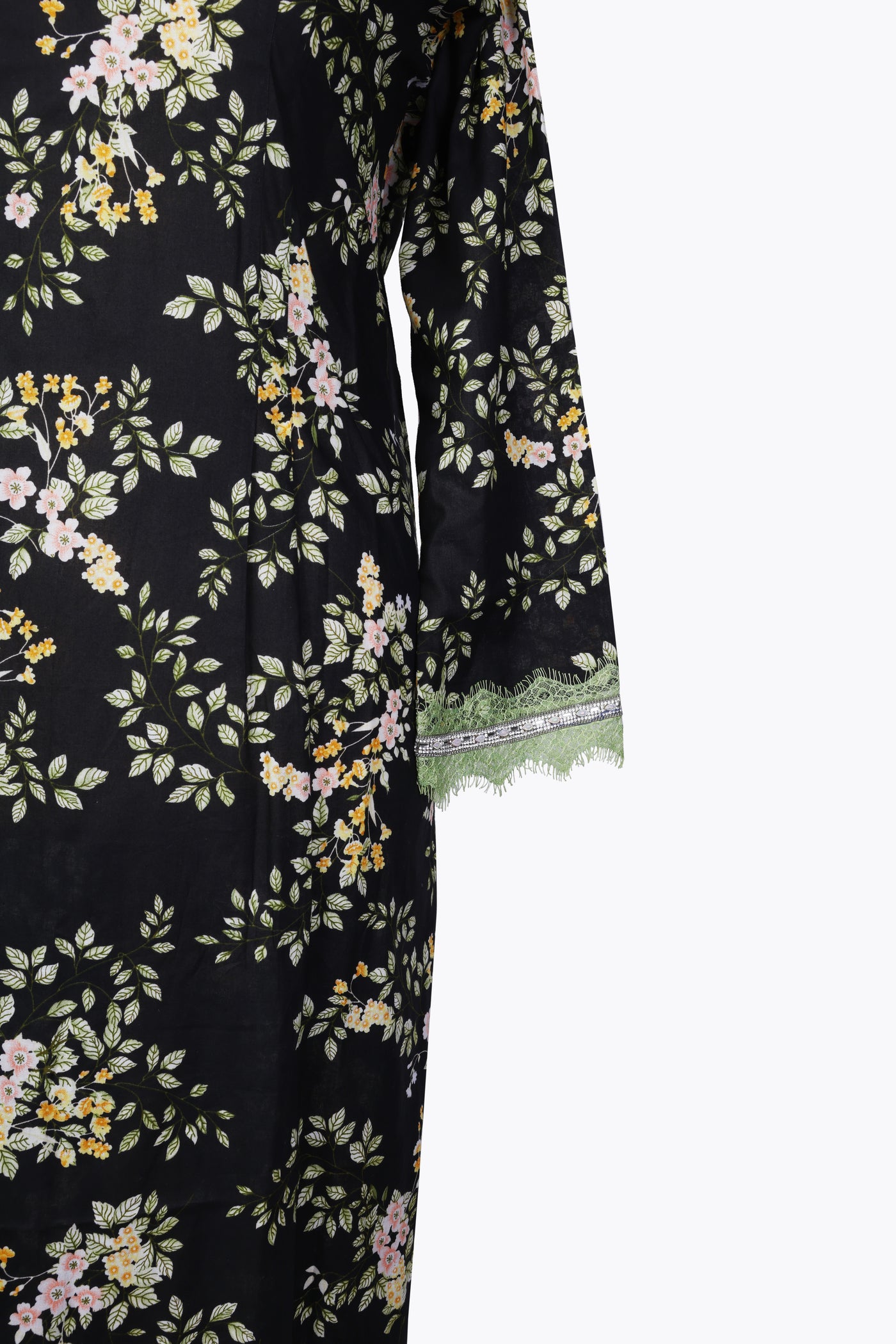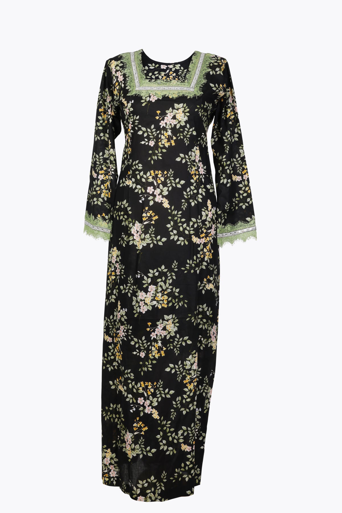This black cotton dress is decorated with a soft floral print in pastel shades, making it elegant yet easy to wear. The neckline features a square shape framed with green lace and delicate embellishments, adding a touch of charm. The same lace detailing is repeated on the cuffs, giving the design a coordinated finish. It is breathable, lightweight, and ideal for both daily use and relaxed evenings.
